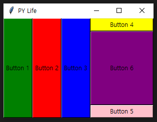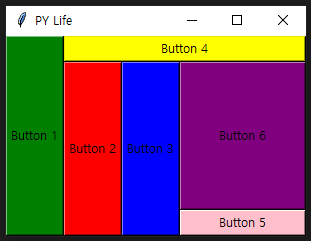 위젯 사이즈에 대한 정의가 없어 padx/pady/ipadx/ipady가 0인 상태라 위젯들이 다소 무질서하게 배치되어 있는 것으로 보일 수 있지만 사실은 아래와 같이 공간을 잠정적으로 점유하고 있다고 생각하시면 됩니다.