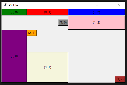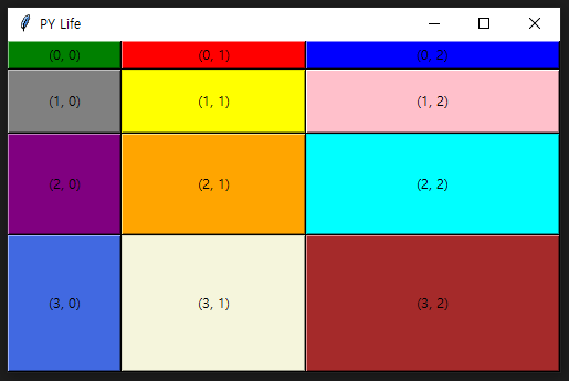 → 셀에 여러 위젯을 배치하려면 Frame 또는 LabelFrame위젯을 래핑하고 셀에 Frame을 배치합니다.