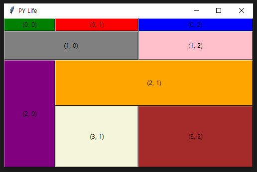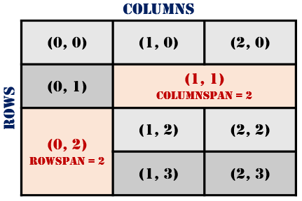 grid()는 row, column 옵션으로 각 셀 위치를 배치할 수 있고 rowspan, columnspan으로 셀을 병합합니다.
