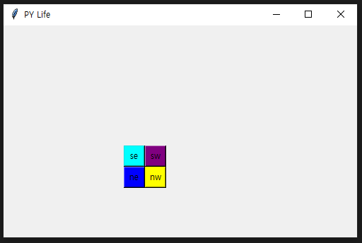 | anchor | 위젯의 기준 위치 | nw | n, s, e, w, nw, ne, es, ws, ns, ew, news |